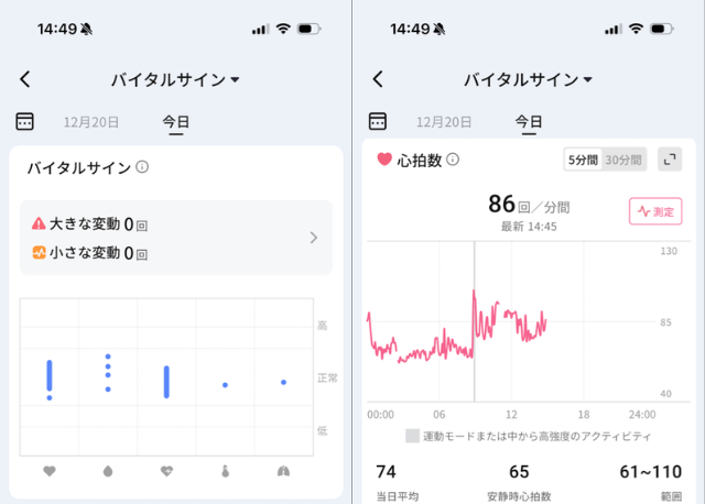 バイタルサインを開くと心拍数など各データを確認することができます。