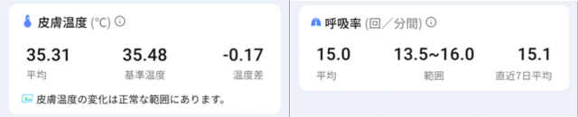 「皮膚温度」は睡眠中の指の皮膚温度を計測、体温とは異なります。「呼吸率」は呼吸率周波数は毎分の呼吸回数を測定します。
