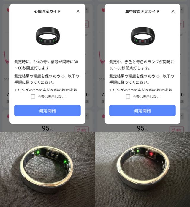 左がリングキットですが左右にある突起、心拍数や血中酸素飽和度を測定するPPGセンサーの凸も再現されています。メーカーではリングキットを24時間以上の着用を推奨しています。
