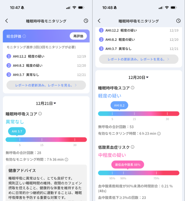 本機最大の特徴が、睡眠中の呼吸状態をモニタリングできる点です。