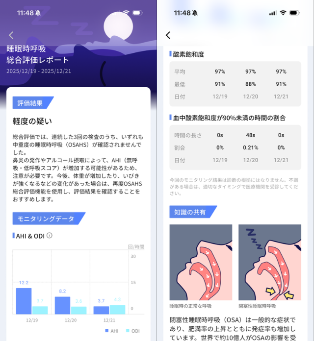 特に僕は気になっていた睡眠時無呼吸症候群のデータで「軽度の疑い」という結果を知ることができたことはメリットです。