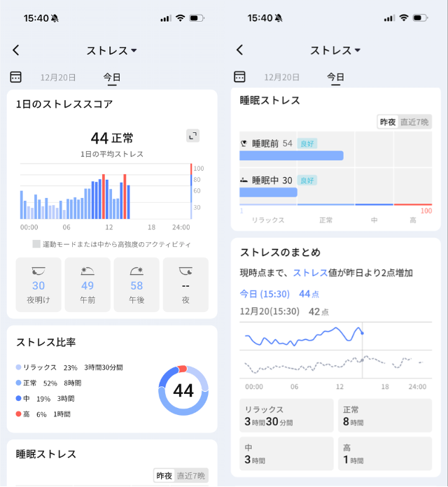 ストレス比率や睡眠ストレスも表示され、24時間のデータを数値で確認することができます。